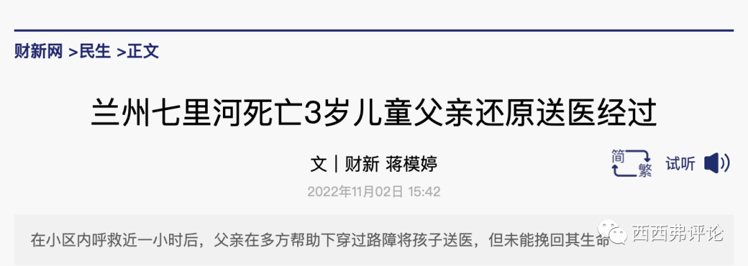 2022年11月1日,兰州市七里河区西园街道一名儿童一氧化碳中毒不幸死亡。13时36分,120急救调度中心要求兰州市第一人民医院急救分站立即停止对执行疫情防控急救车辆消杀工作,13时44分发出救护车派车指令。13时48分,七里河区公安分局西园派出所指派两名民警出警。13时57分,出警民警到达现场。13时47分,两名群众跑到骆驼巷路口卡口点向驻守干部苏某和反映情况,苏某和告知先拨打120,同时通过对讲机向社区书记刘某志报告。经持续心肺复苏,患儿呼吸循环仍未能恢复,抢救无效,于15时宣布死亡。经救治,牟某白生命体征恢复正常,随即出院。兰州市疫情防控七里河区督导组2022年11月3日